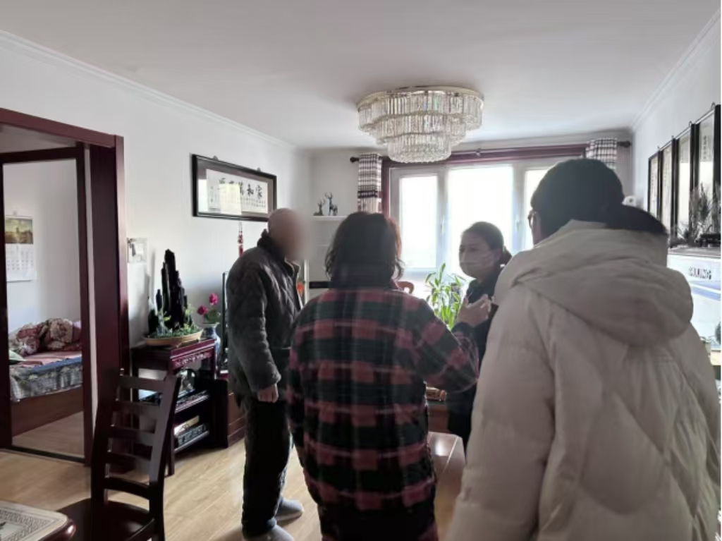 因为两位老人长期独自居住,且有基础病,平时社区的工作人员就一直特别关注老人的身体和精神情况,时常通过微信问候和上门看望的方式关心老人。老人通过微信反映情况后,社区第一时间派社工王萱和刘丹入户了解情况,两人与孙大爷核实了空调位置和噪音产生时间,同时又从包楼社工处了解到楼下业主已将房屋委托给中介公司出租,目前是一家公司的宿舍,只有一名女孩居住。