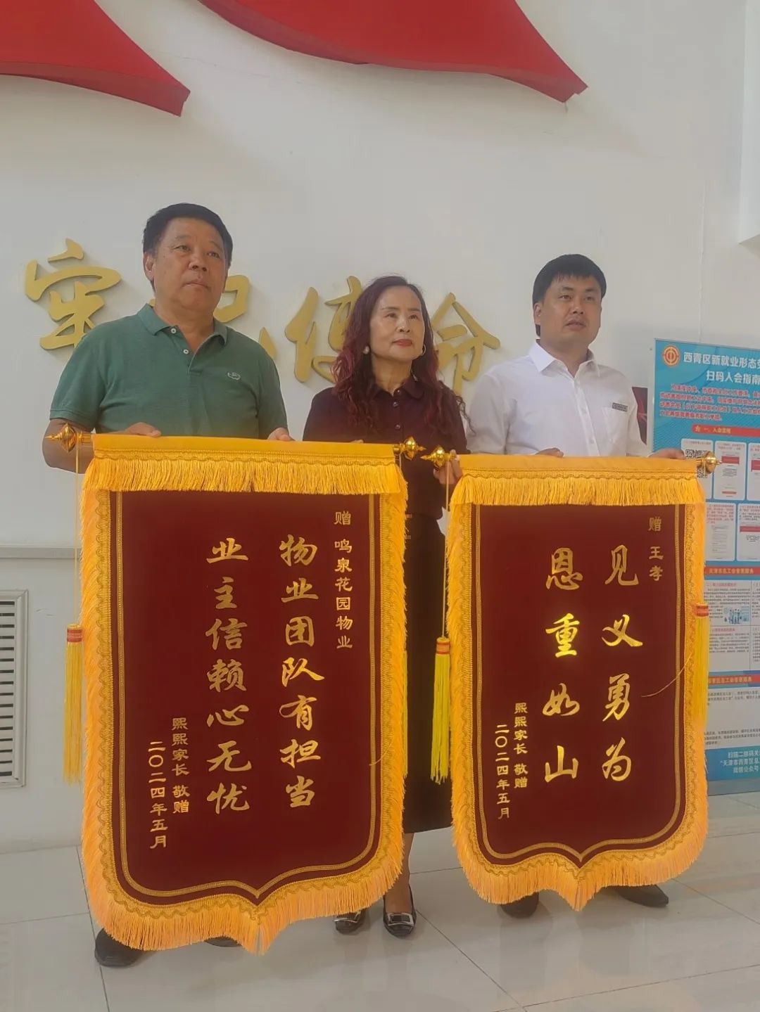 5月21日下午,年近70的纪阿姨拿着两面锦旗走进了富力津门湖第一社区党群服务中心,这里也是天力物业公司的办公地。见到王孝时,纪阿姨深深鞠了一躬,“谢谢你啊,救了我的小外孙!”