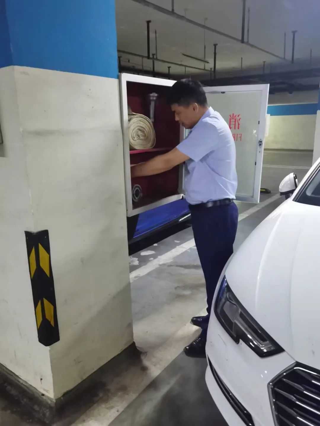 赵学昊记得,一年冬天夜里11点多,小区一栋楼的消防管道出现了漏点,水从管道流出来,顺着地下室的楼道流向车库。赵学昊在工作群里发了条消息,召集有条件的同事回来帮忙。