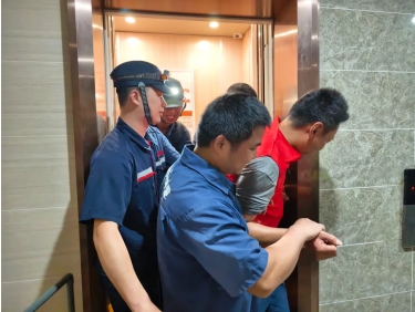 物业工作人员模拟设置电梯困人场景。当被困人员通过五方通话发出求救信号,监控室值班人员迅速做出反应,立即启动应急预案,同步联动各相关部门奔赴现场,同时密切监测被困人员状态,耐心指导被困者保持冷静,切勿擅自开启电梯门。