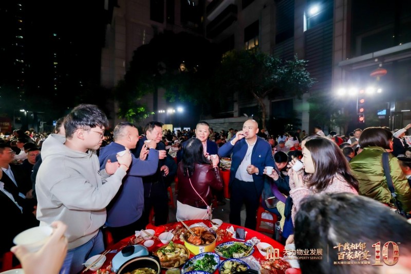 夜幕下的小区广场热闹非凡,红色的舞台背景上“十载相邻 百家新宴”的字样格外醒目,数百张餐桌沿广场依次排开,琳琅满目的家常菜香气四溢。业主们端出的糖醋鱼、红烧肉、拿手点心等“百家菜”摆满餐桌,从老人到孩童,从本土住户到外籍邻居,纷纷举杯互动,现场笑语不断。